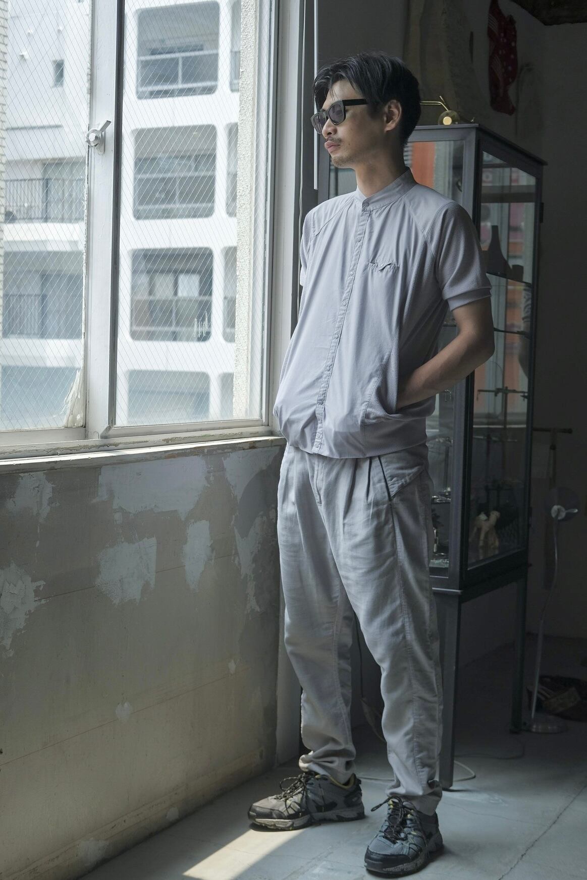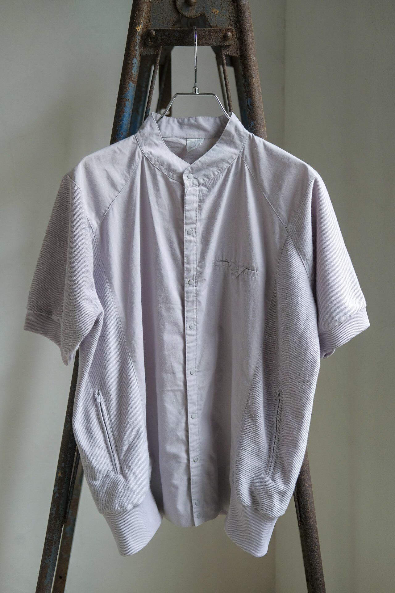 素材の切り返しが面白い半袖のスタンドカラーシャツ