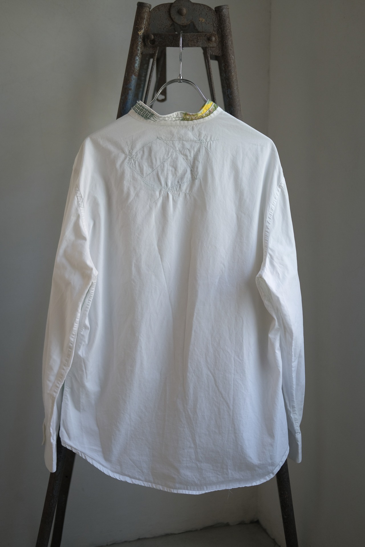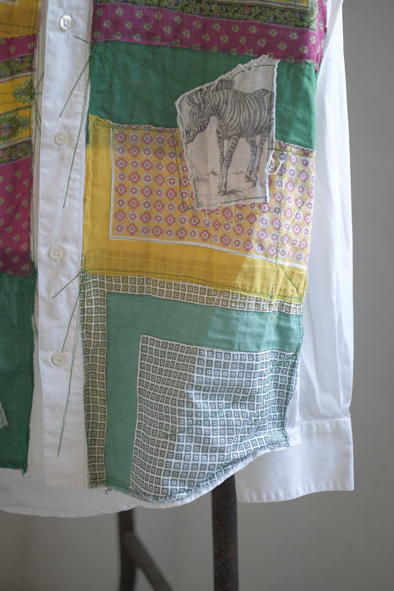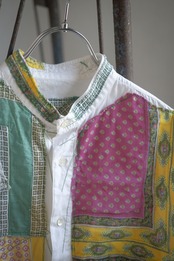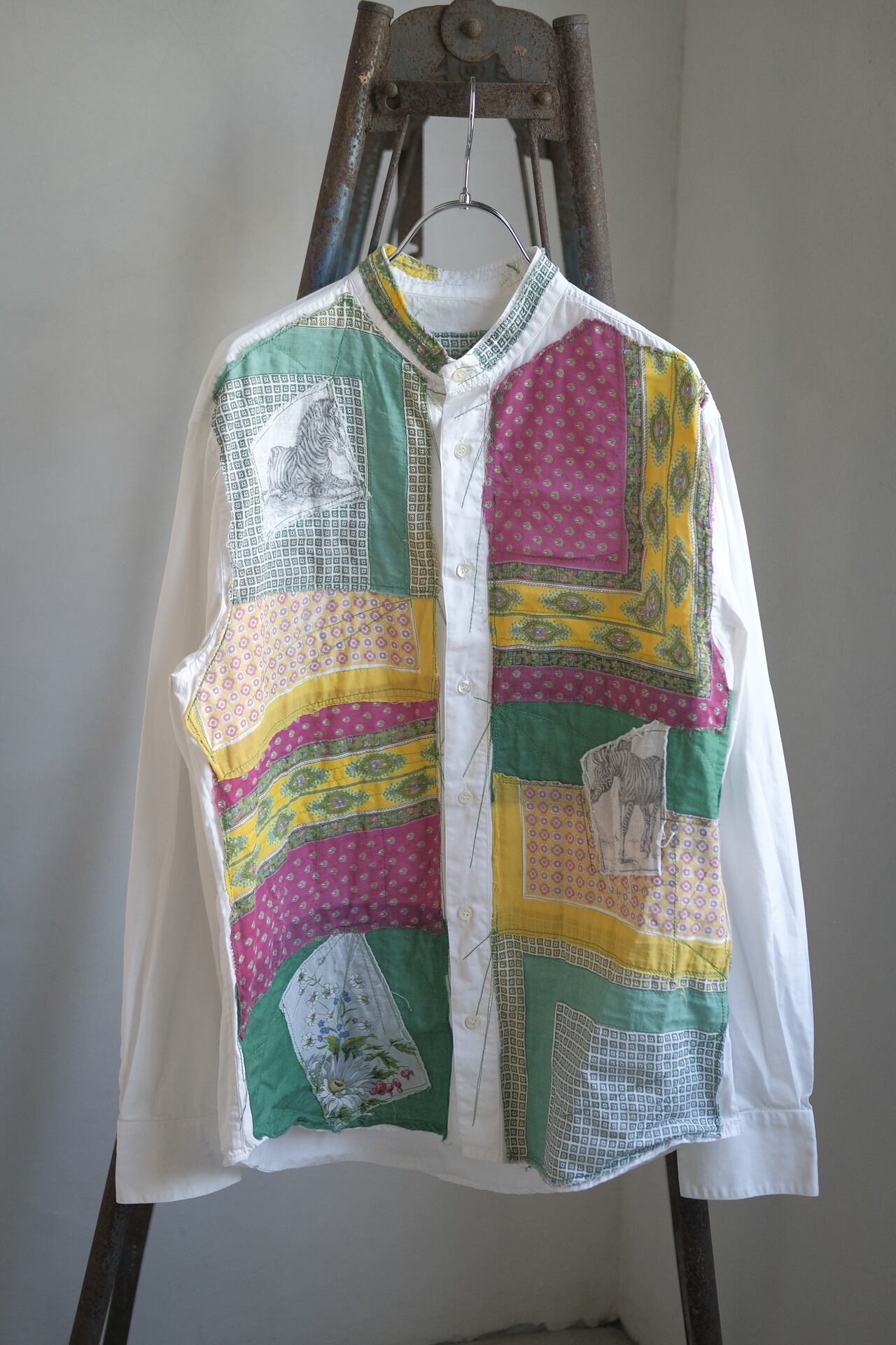 白いスタンドカラーシャツの上からパッチワークでリメイクされたシャツ
