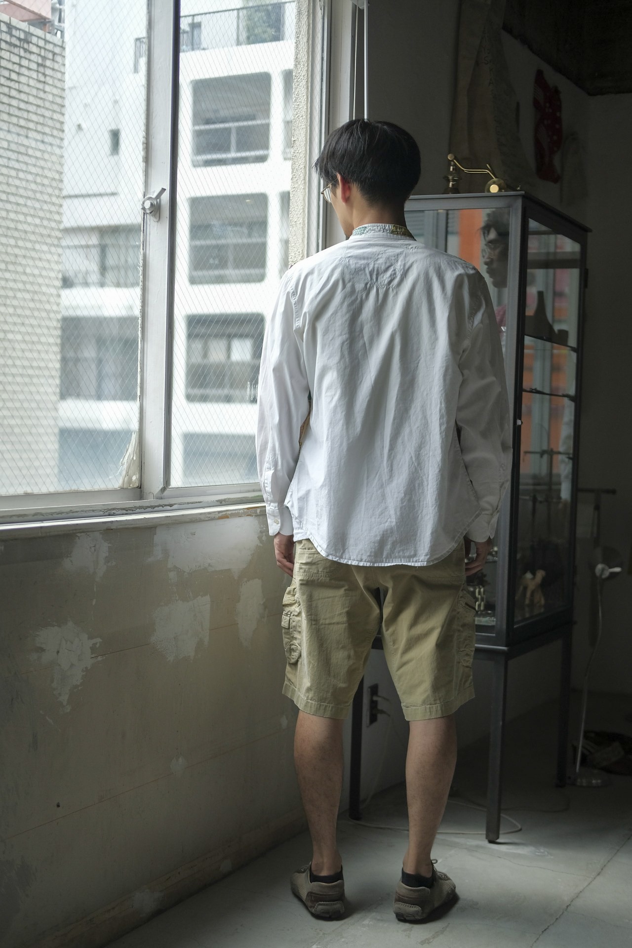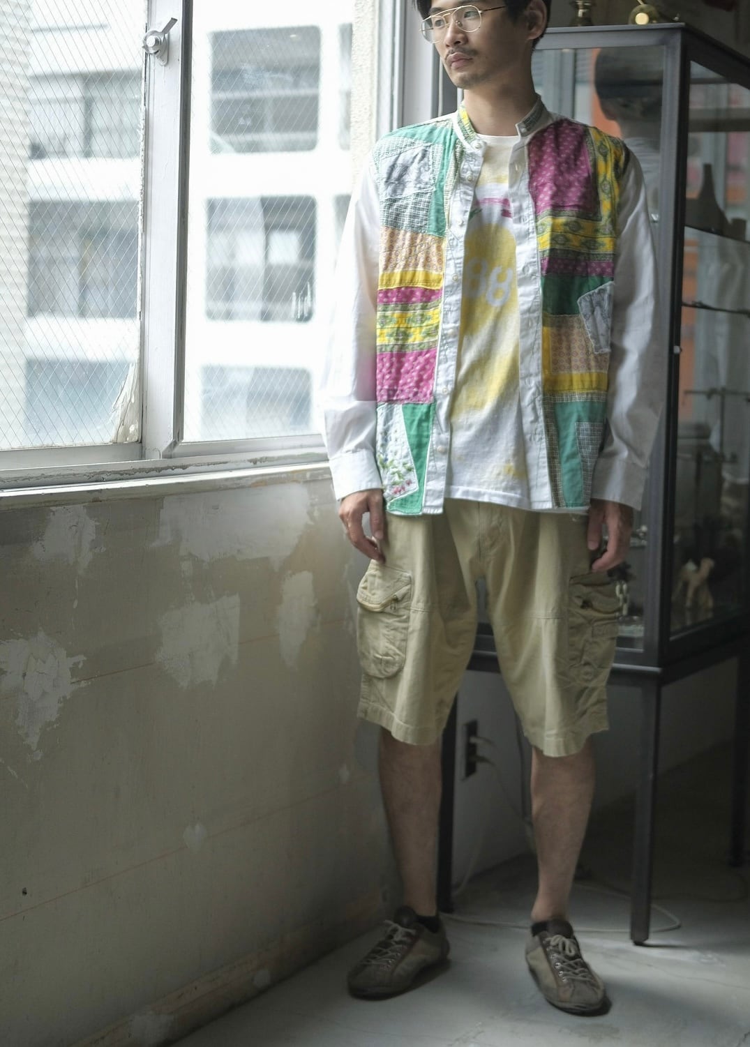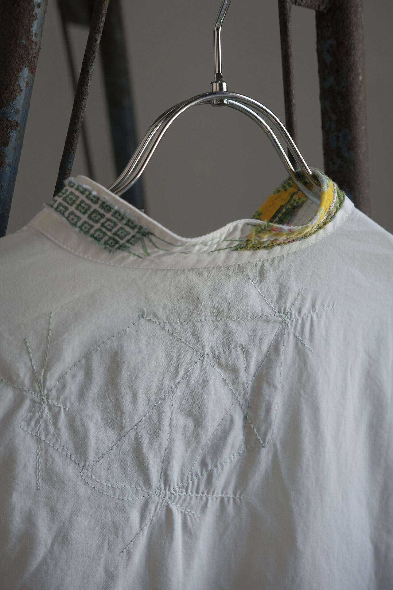 白いスタンドカラーシャツの上からパッチワークでリメイクされたシャツ