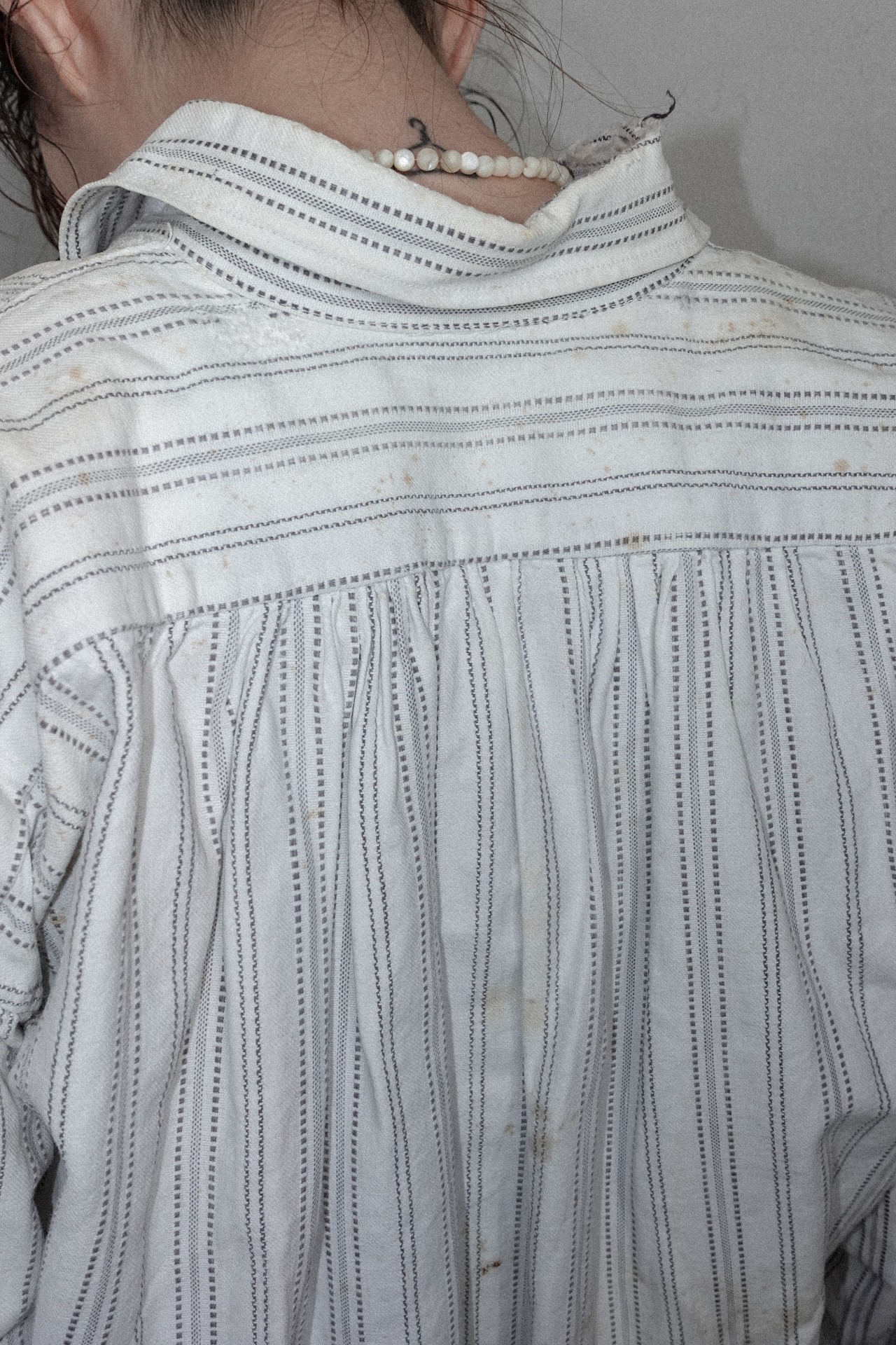しっかりとしたコットン生地は、長い年月を経て柔らかくなり、独特の落ち感を見せています。フロントや裾にシミ・汚れによるボロ感はありますが、雰囲気抜群で是非大人の女性に来て頂きたい一着です。
