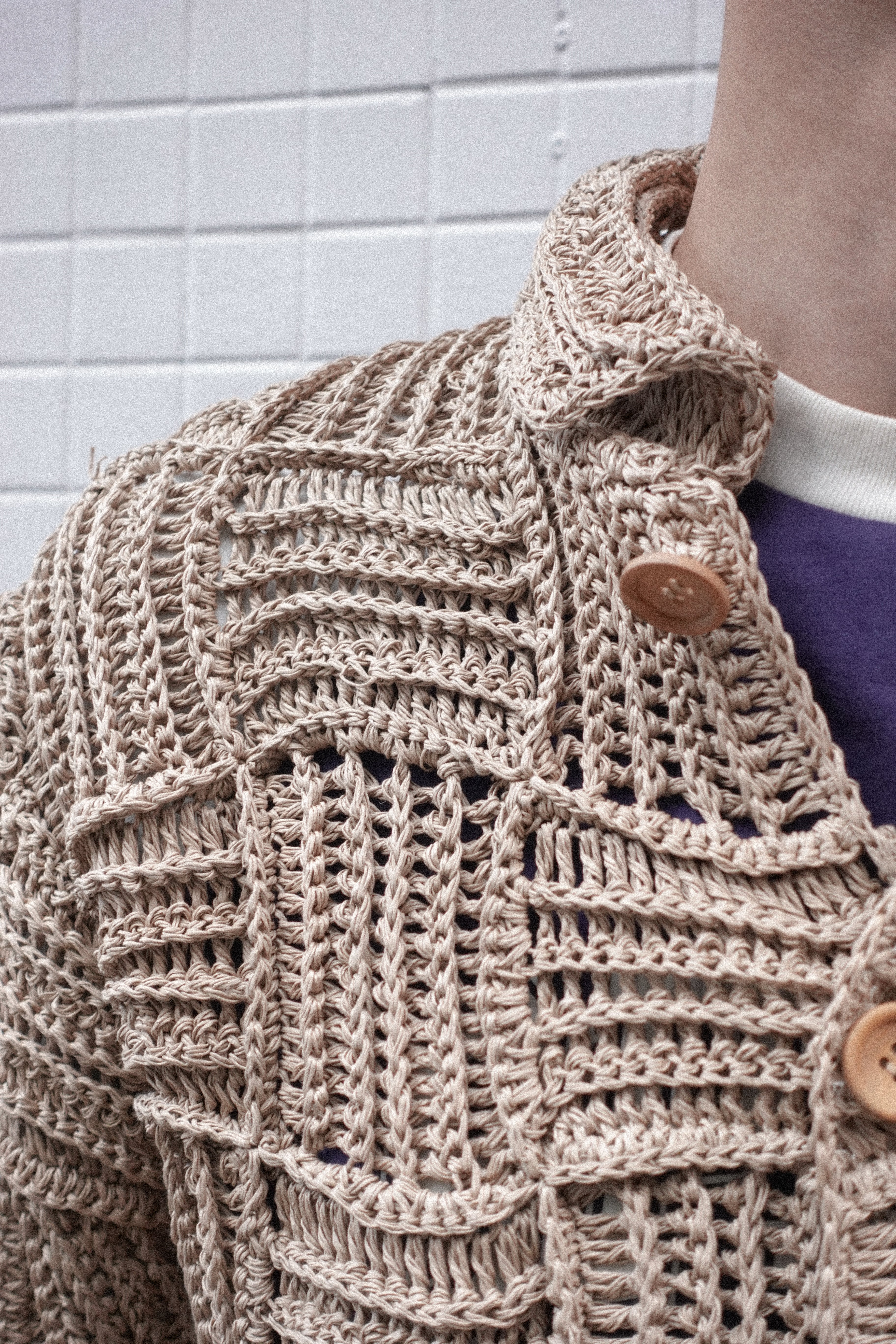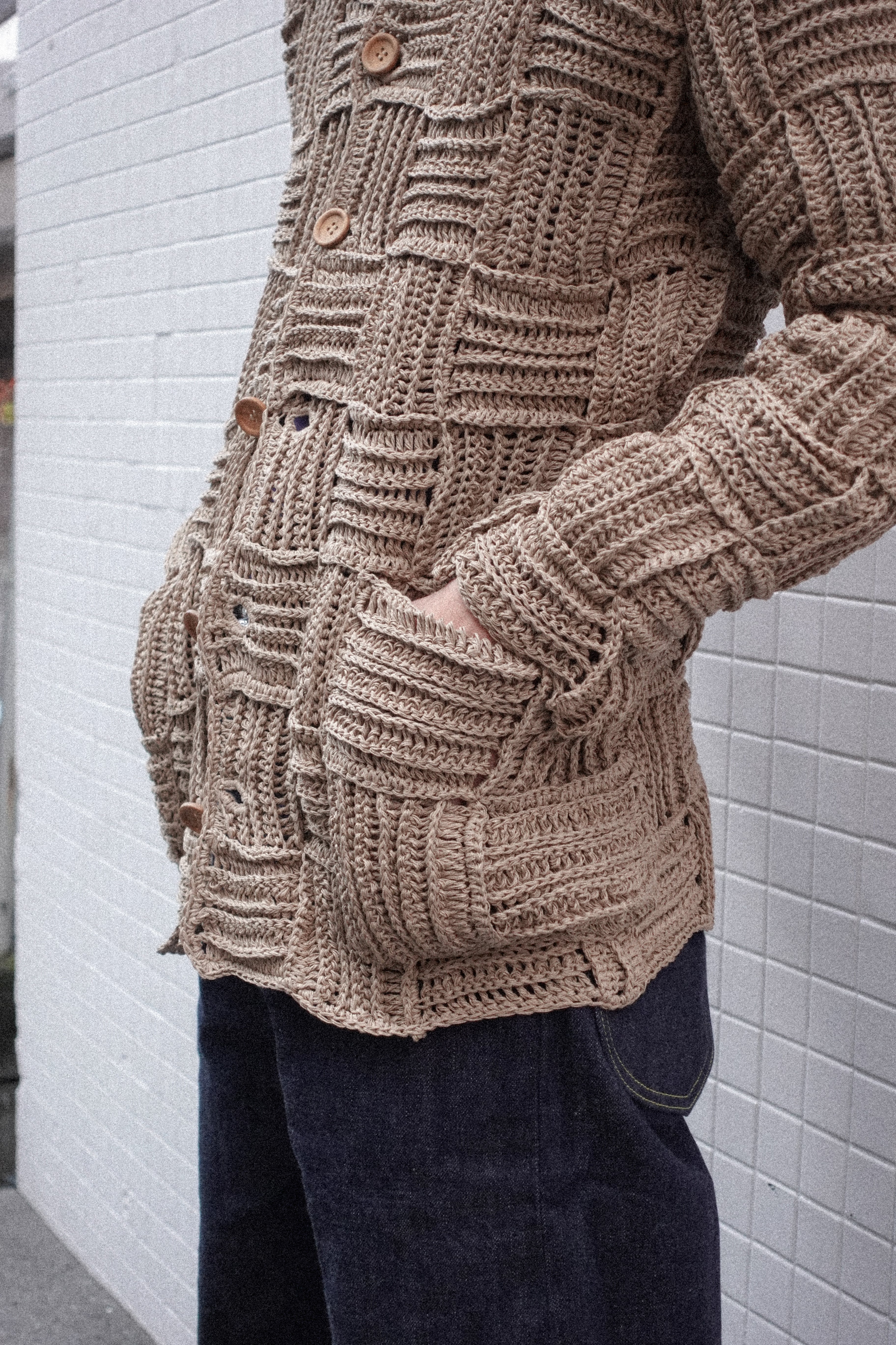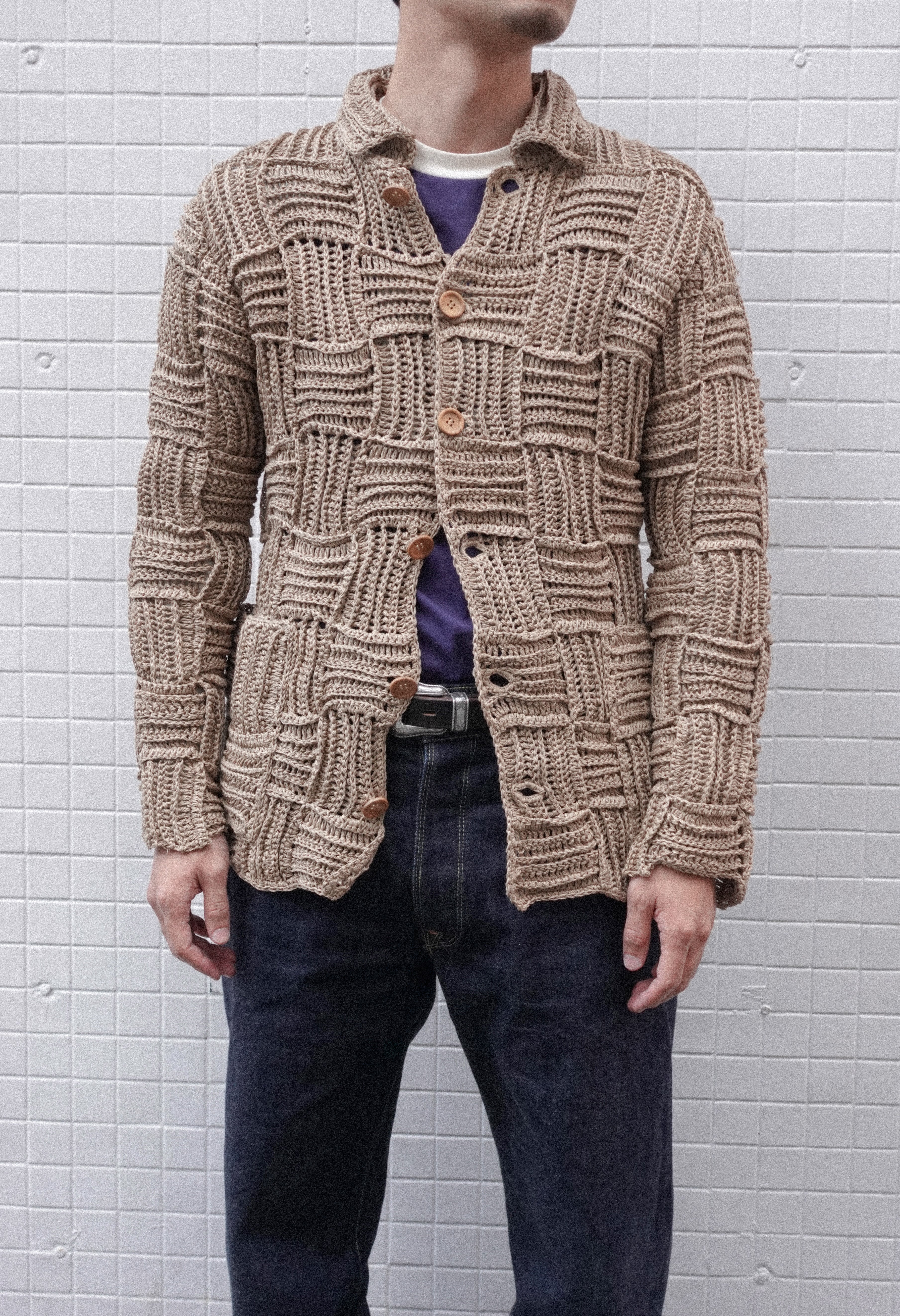 パッチワークのような見た目で、ブロックごとに縦と横の網目を繰り返した芸術品のようなニット