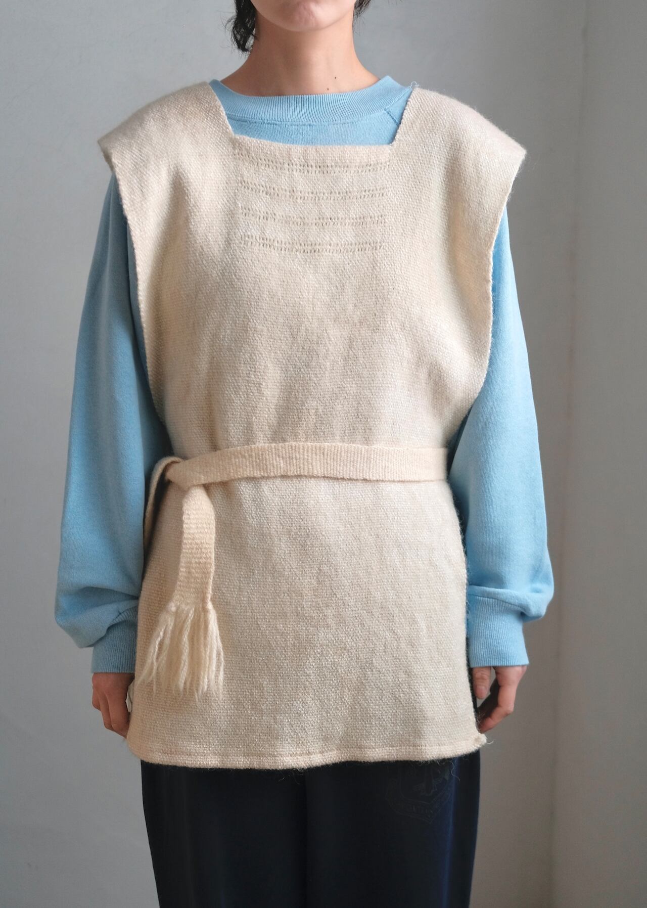 背面側ウエストの左右に、長さの異なる紐がついており、いろんな遊び方ができそうなこちらのニットベスト。男女問わず着用できます。