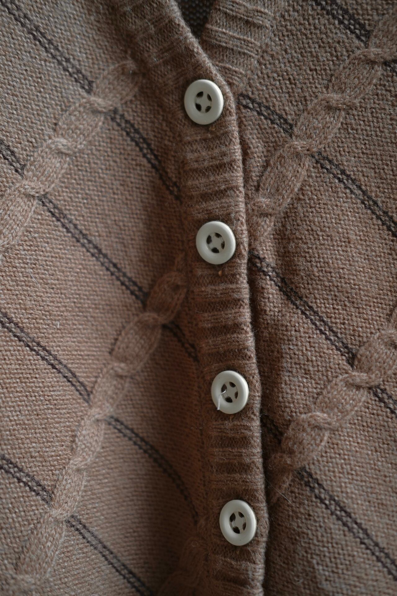 ケーブル編みと茶色のラインが交差したデザインのカーディガン
