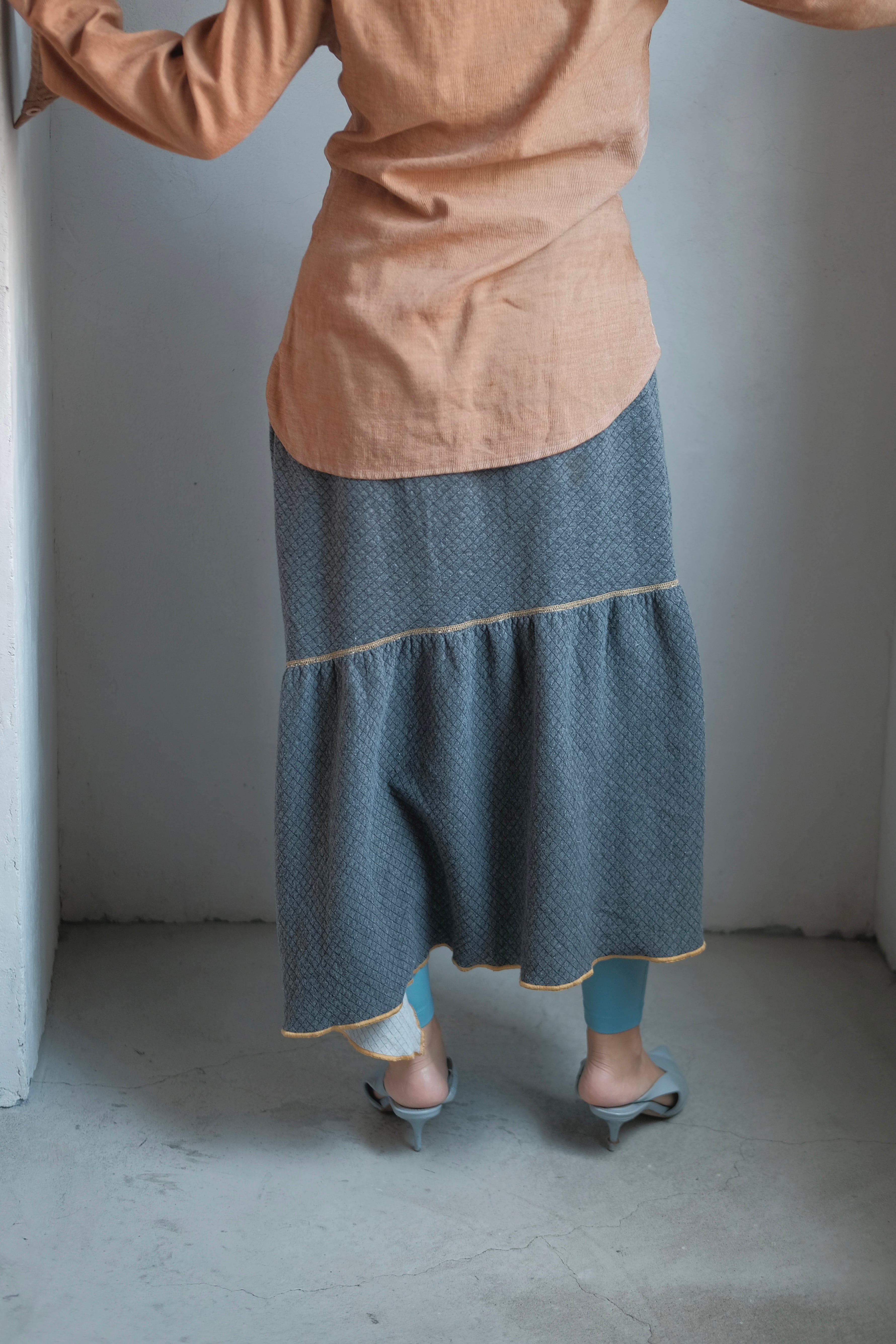 生地は薄手のキルティングのようで、アシンメトリーな感じで右下りの独特なシルエットをしています