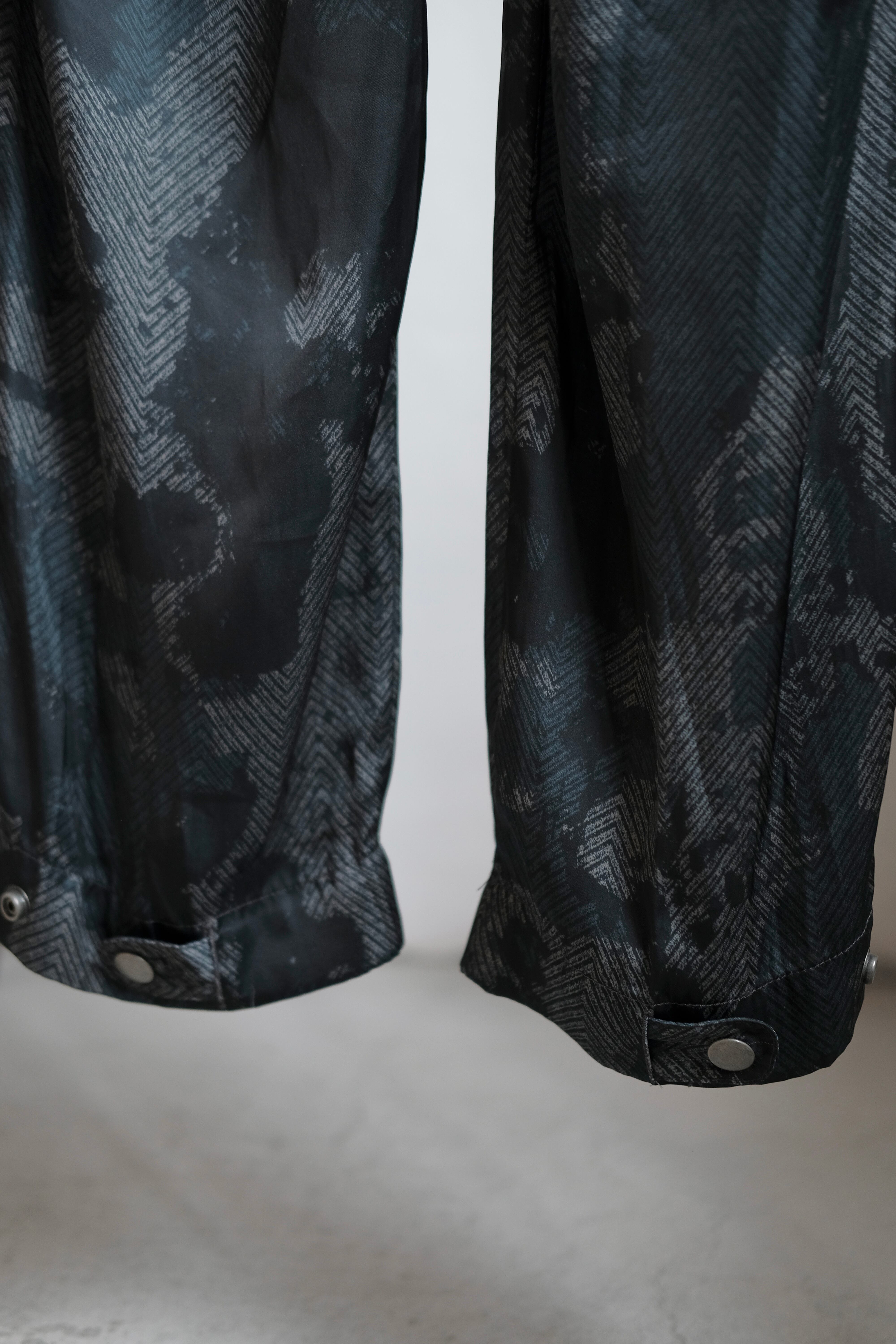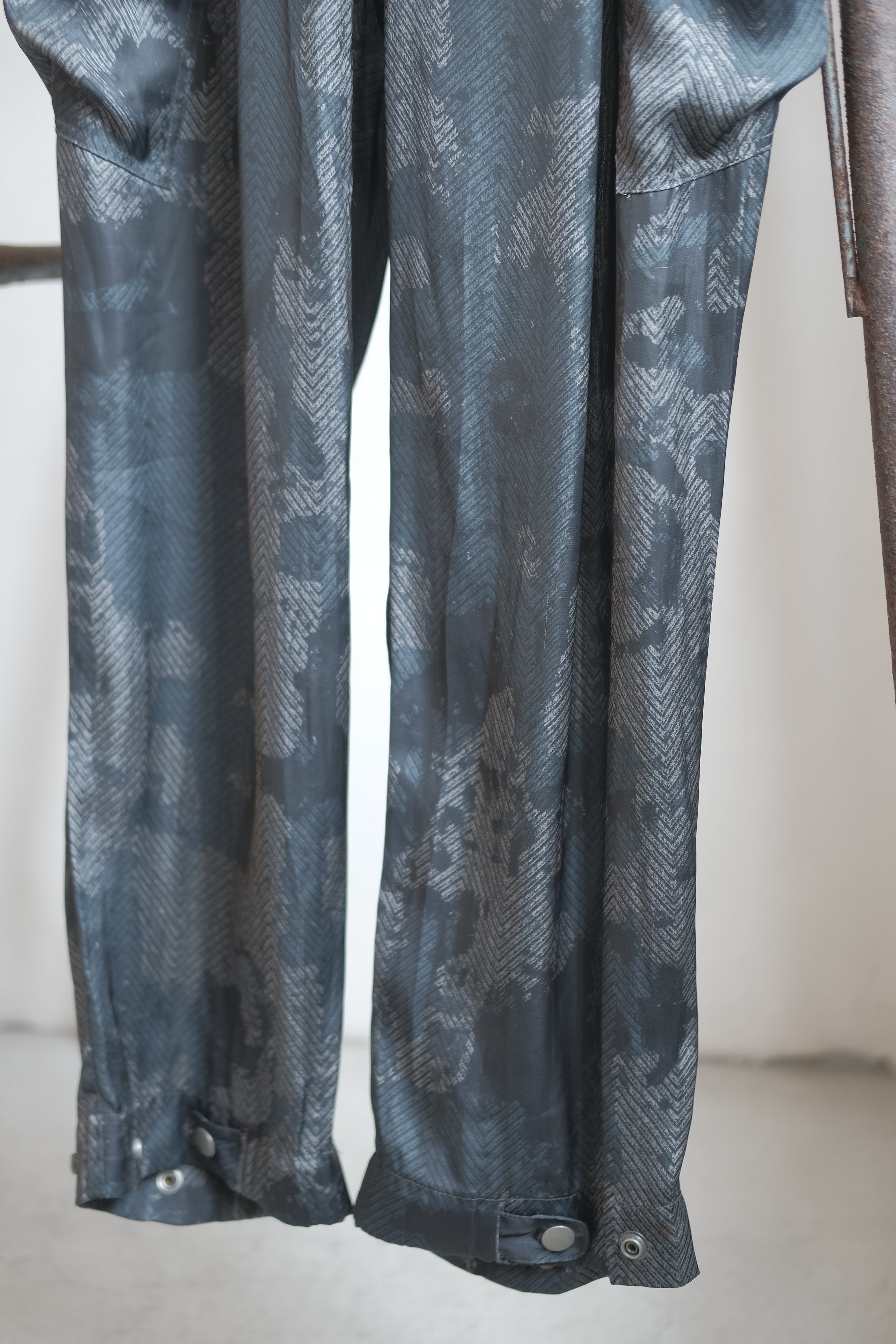 ひんやりサラッとしたサテンシャツみたいな生地感で、カモ柄がプリントされたカーゴパンツ
