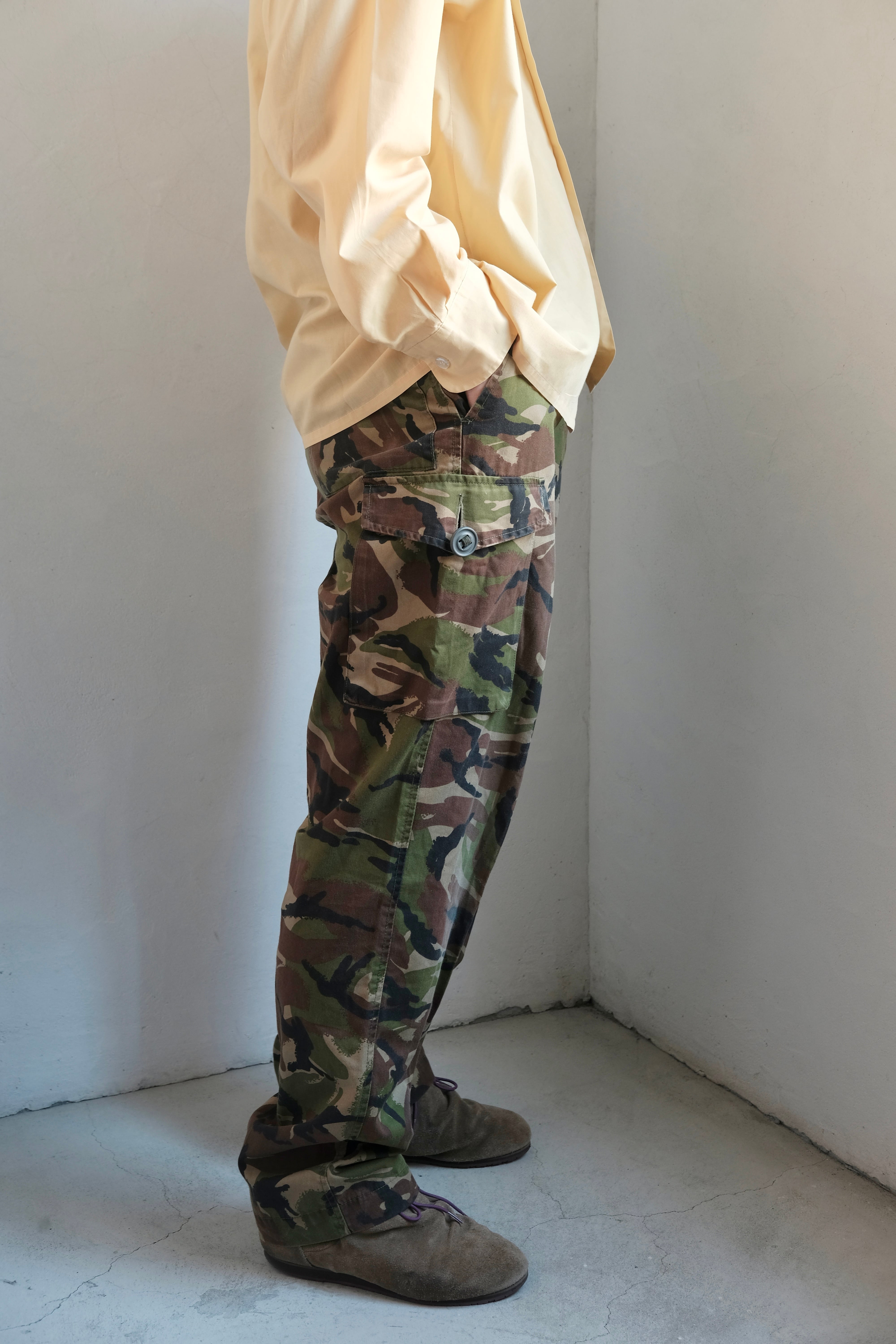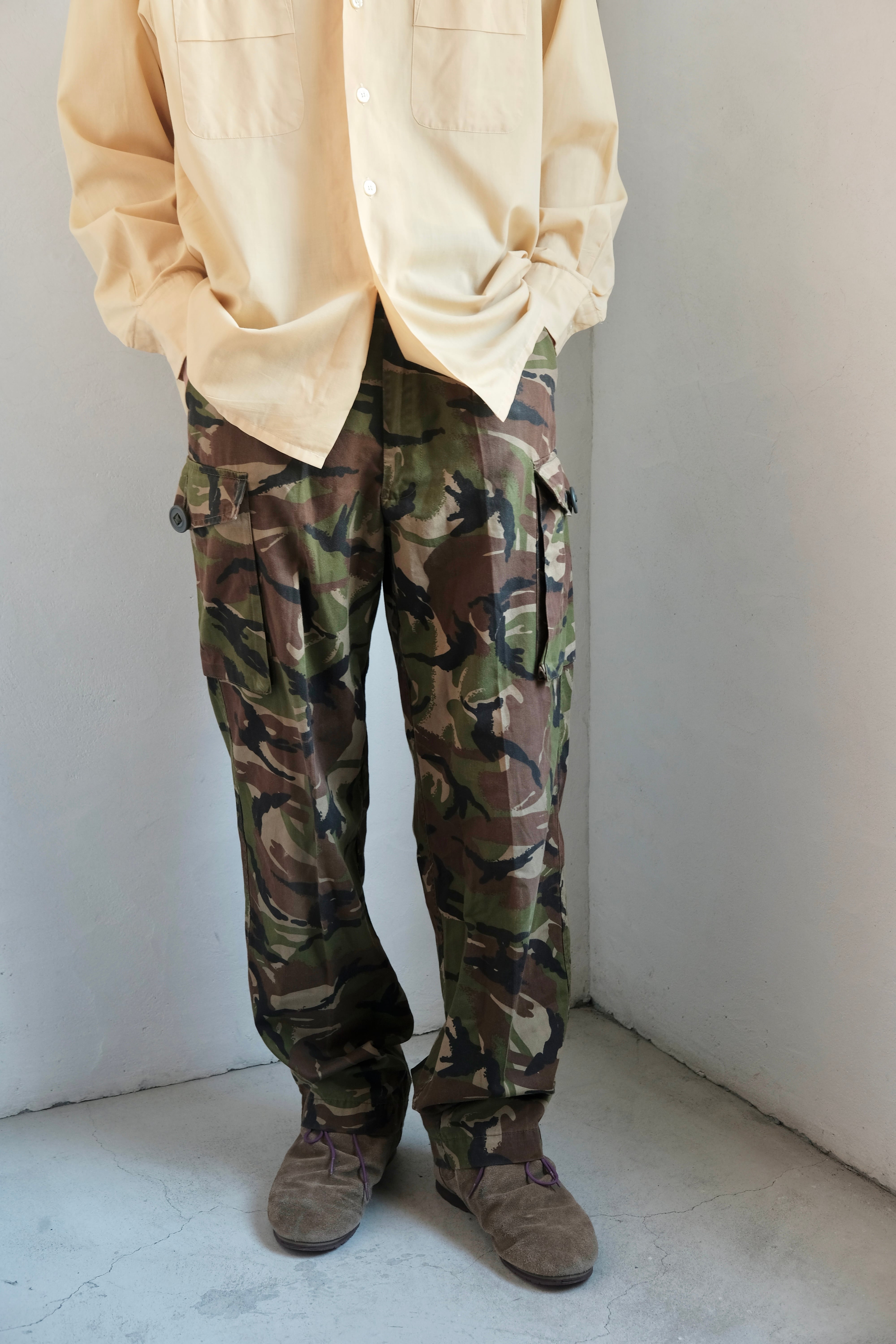 無骨なイメージのカモ柄のカーゴパンツですが、こちらのパンツはキレイめなアイテムとも相性が良いシルエットで、普段カモ柄とか苦手な人は是非履いてみて欲しいです