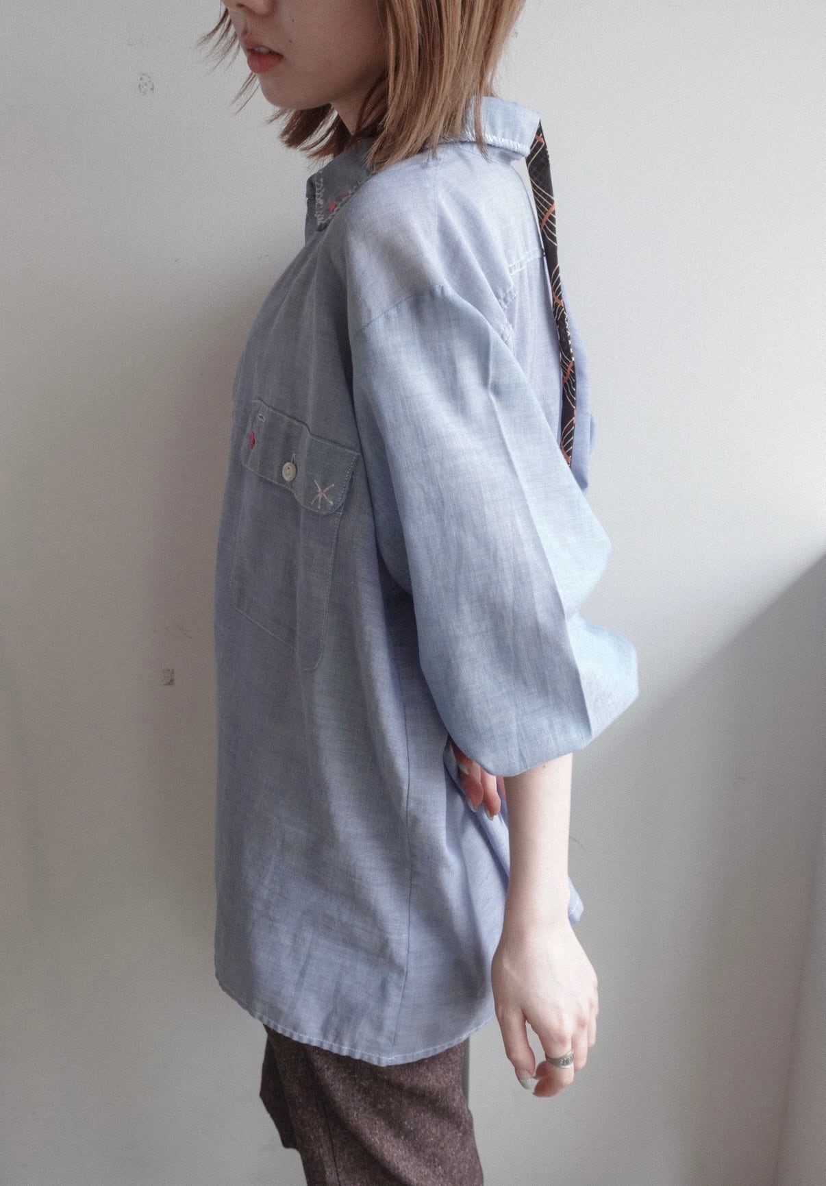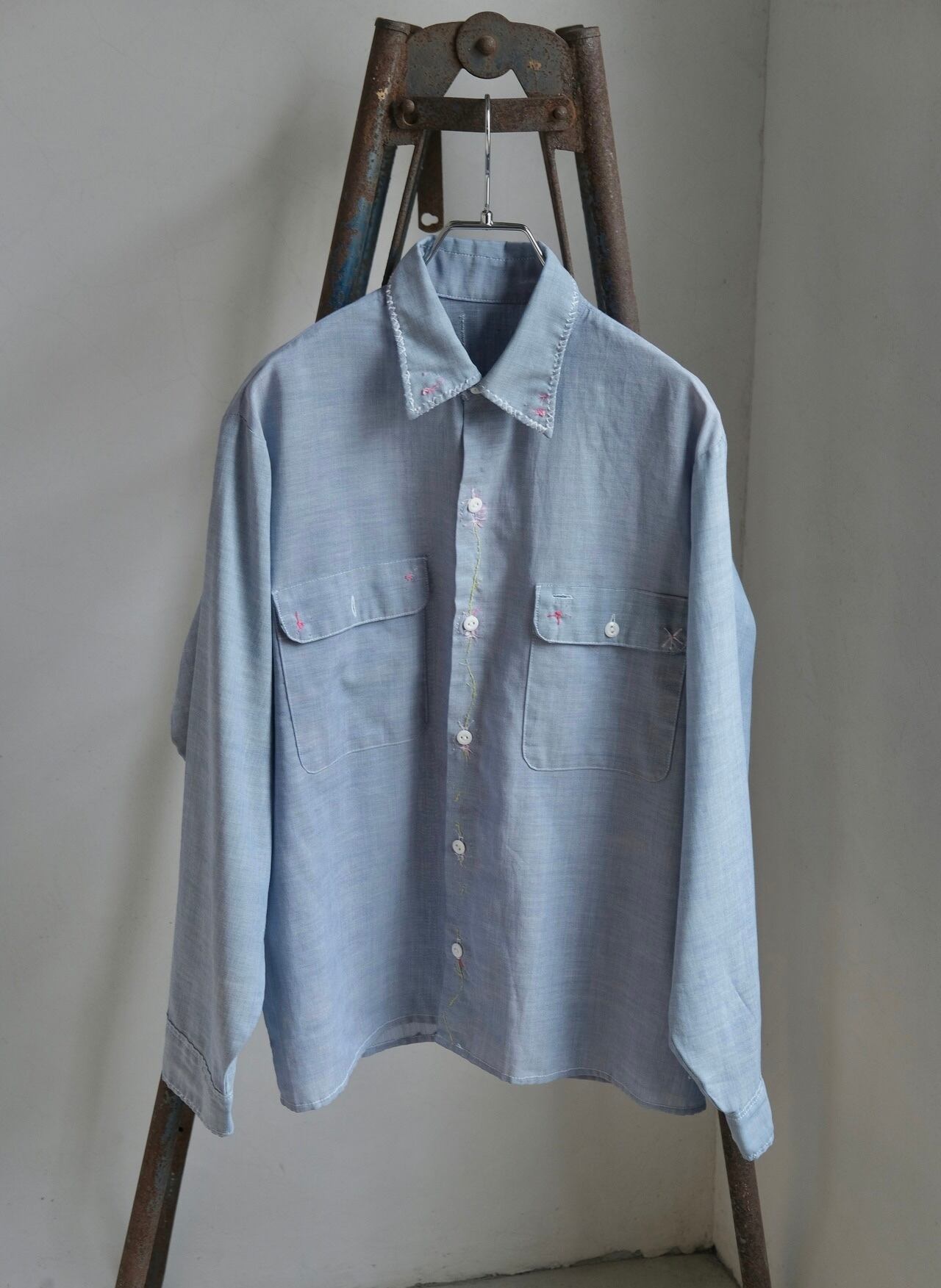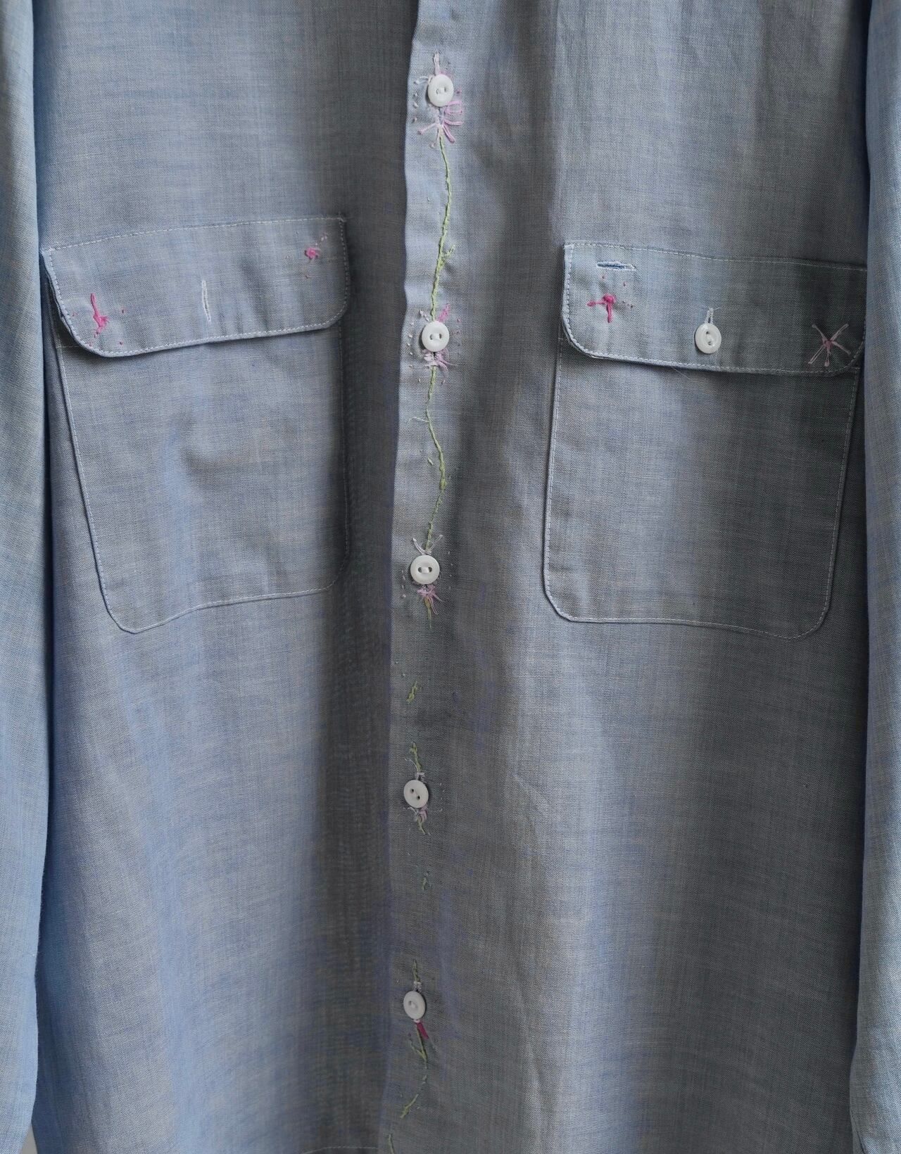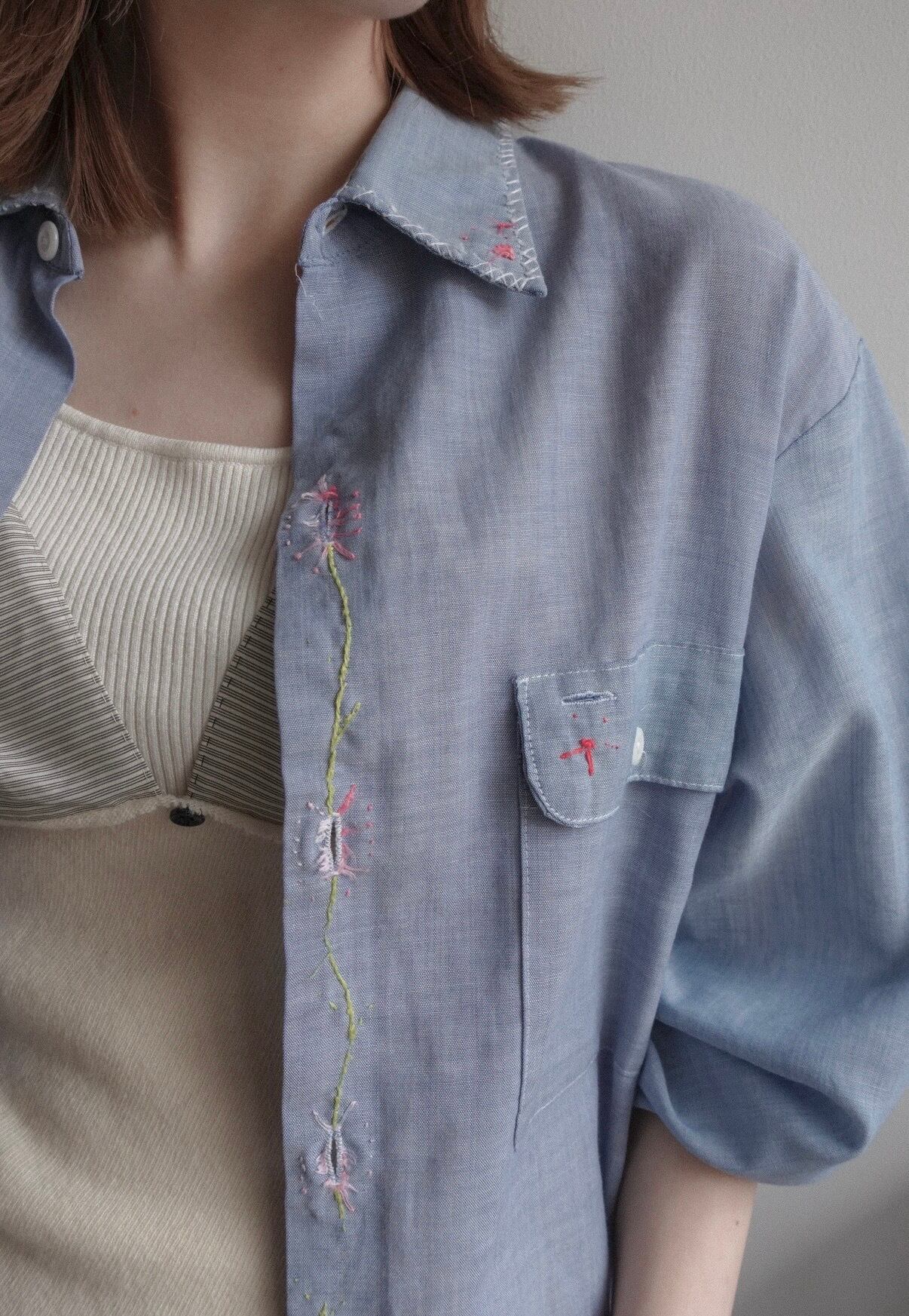 所々に花の刺繍が施されたシャツ
