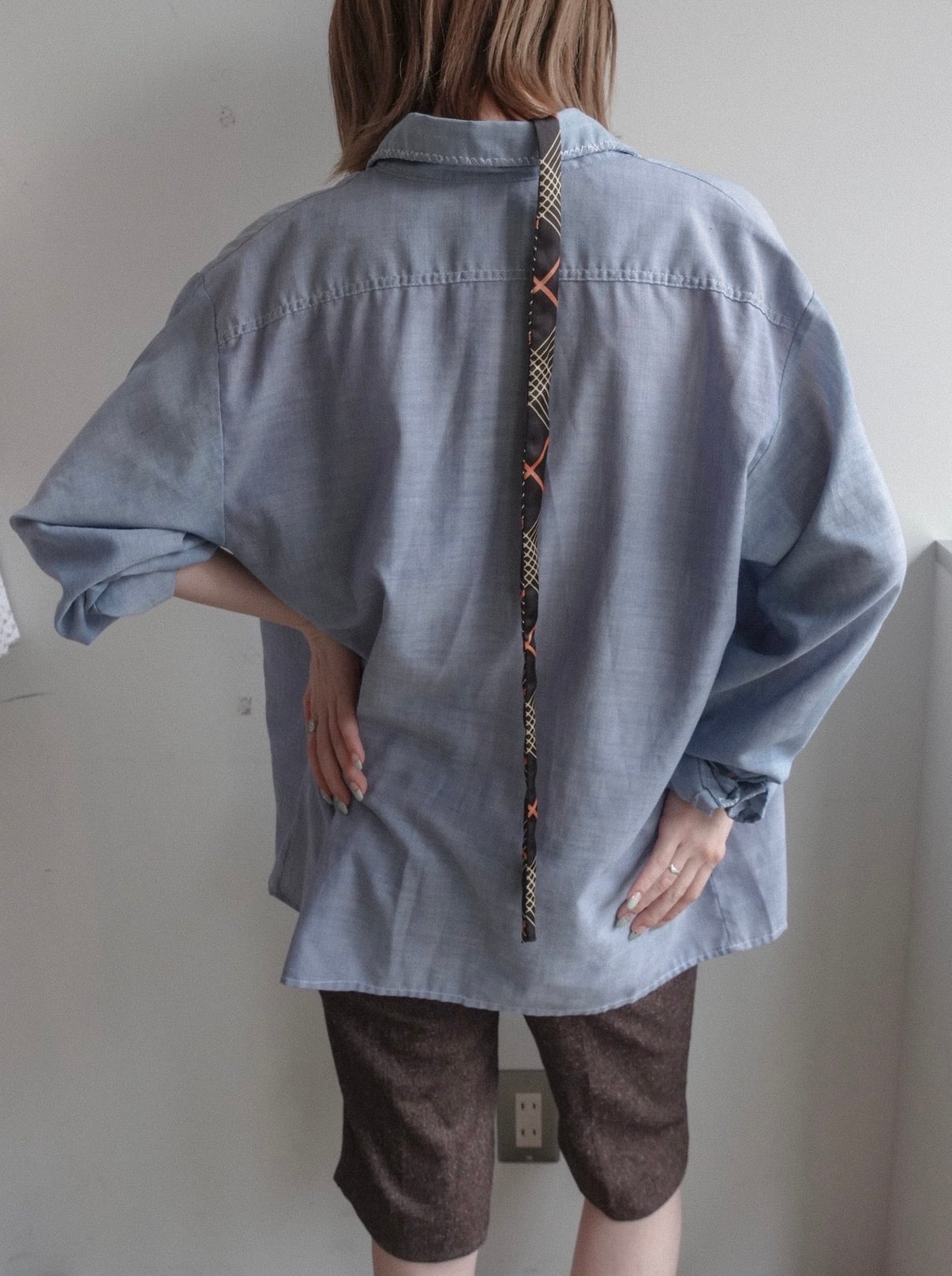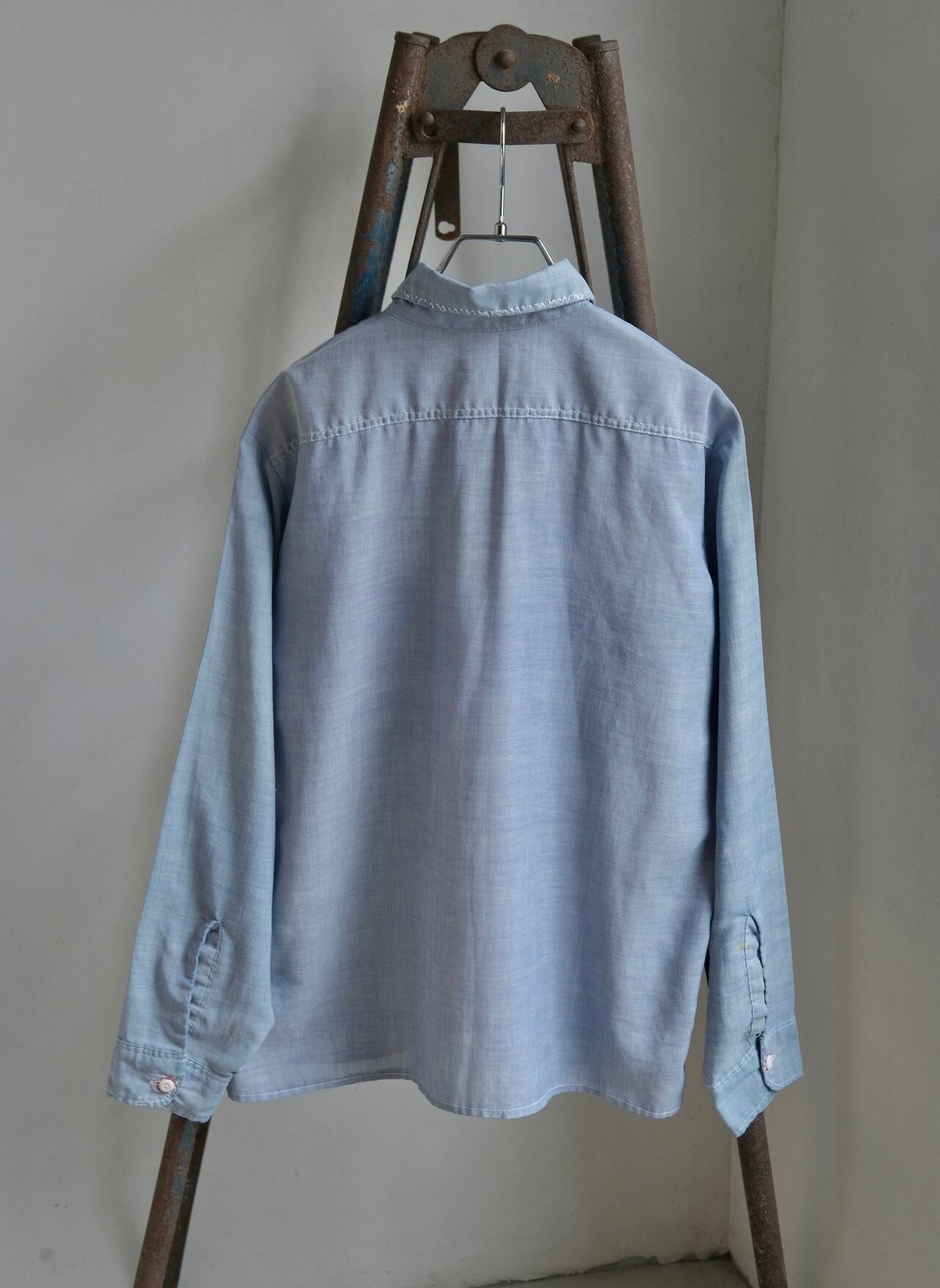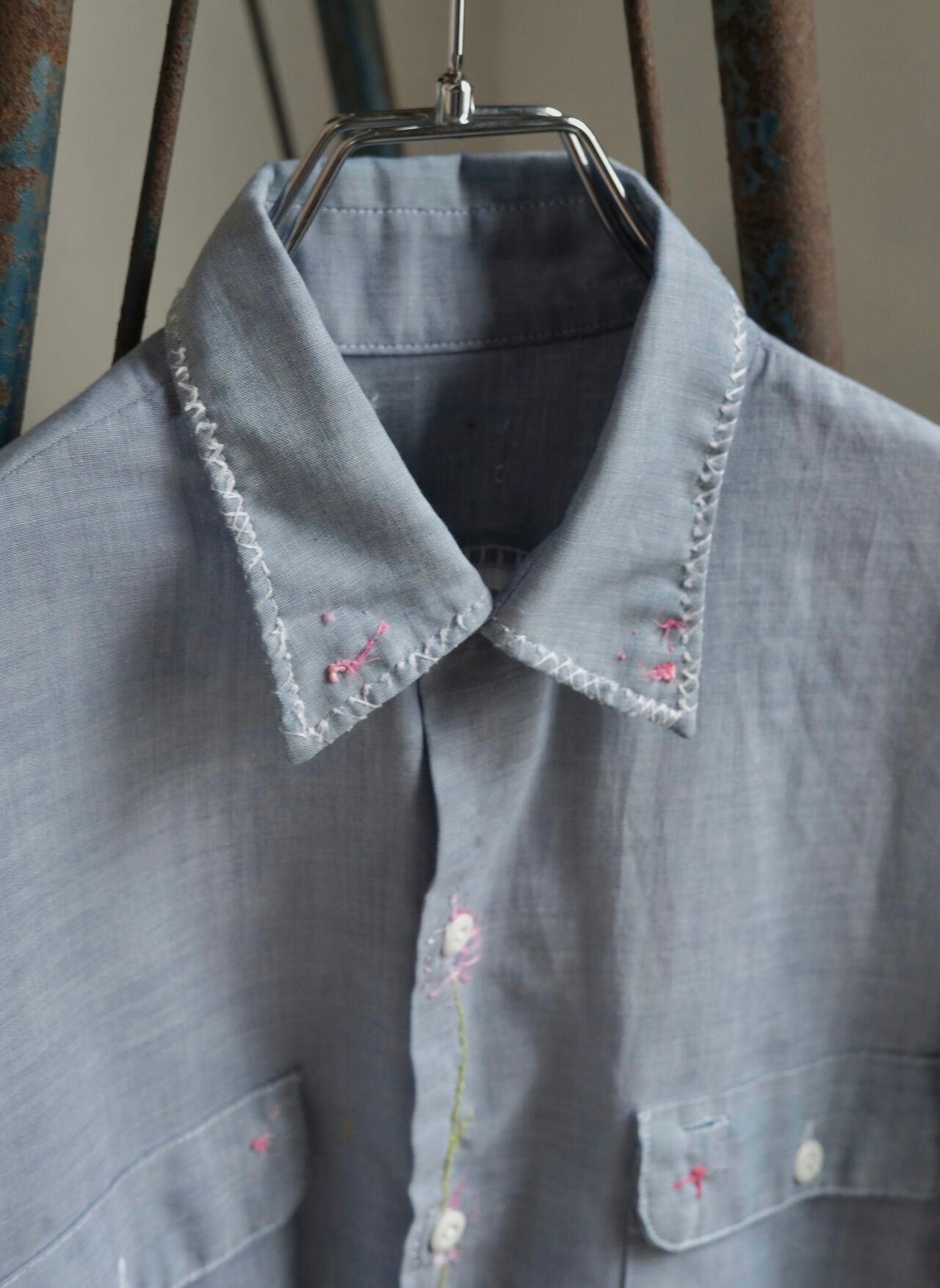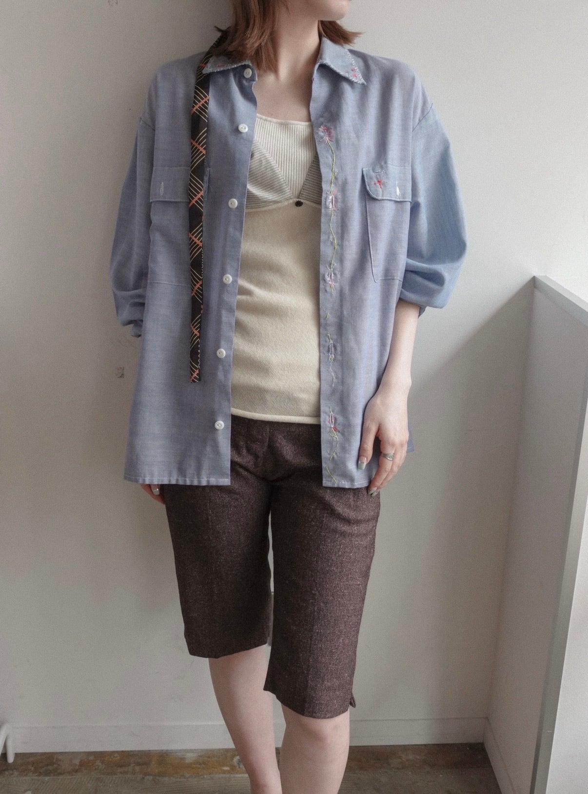 所々に花の刺繍が施されたシャツ