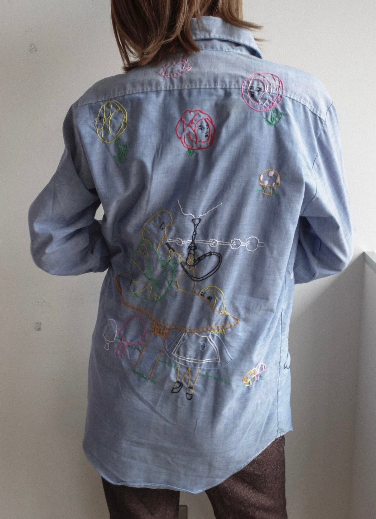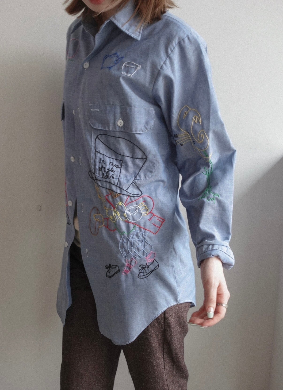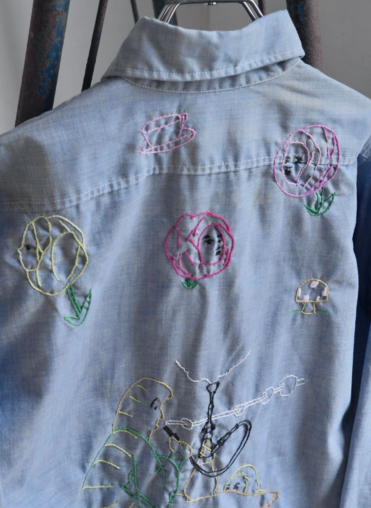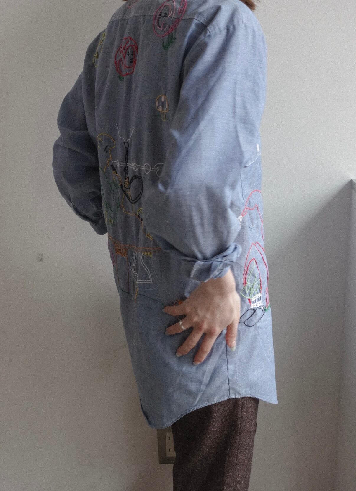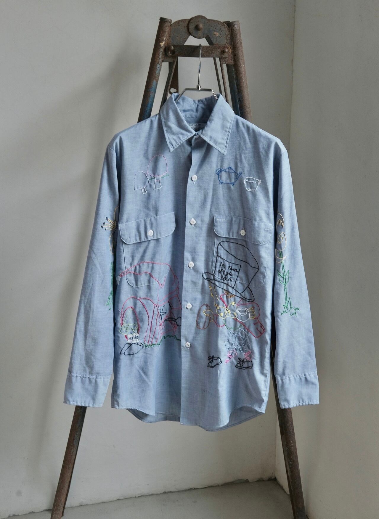 淡いブルーのボディ全面に手刺繍が施されたこちらのシャツ。子供が落書きをしたような、そんな遊び心たっぷりなデザインです。