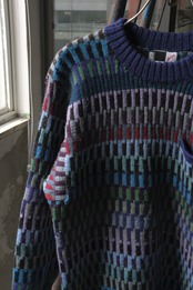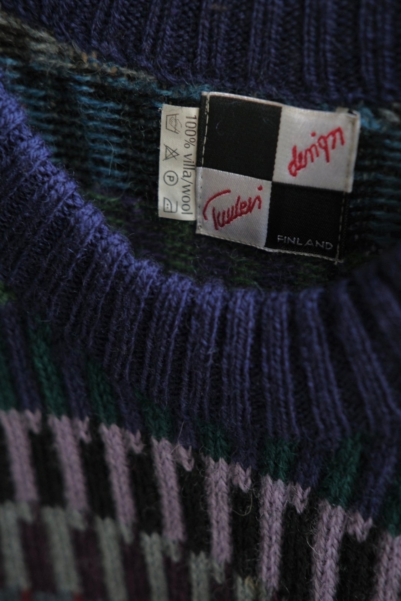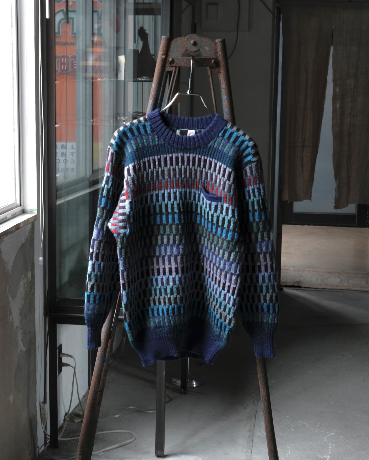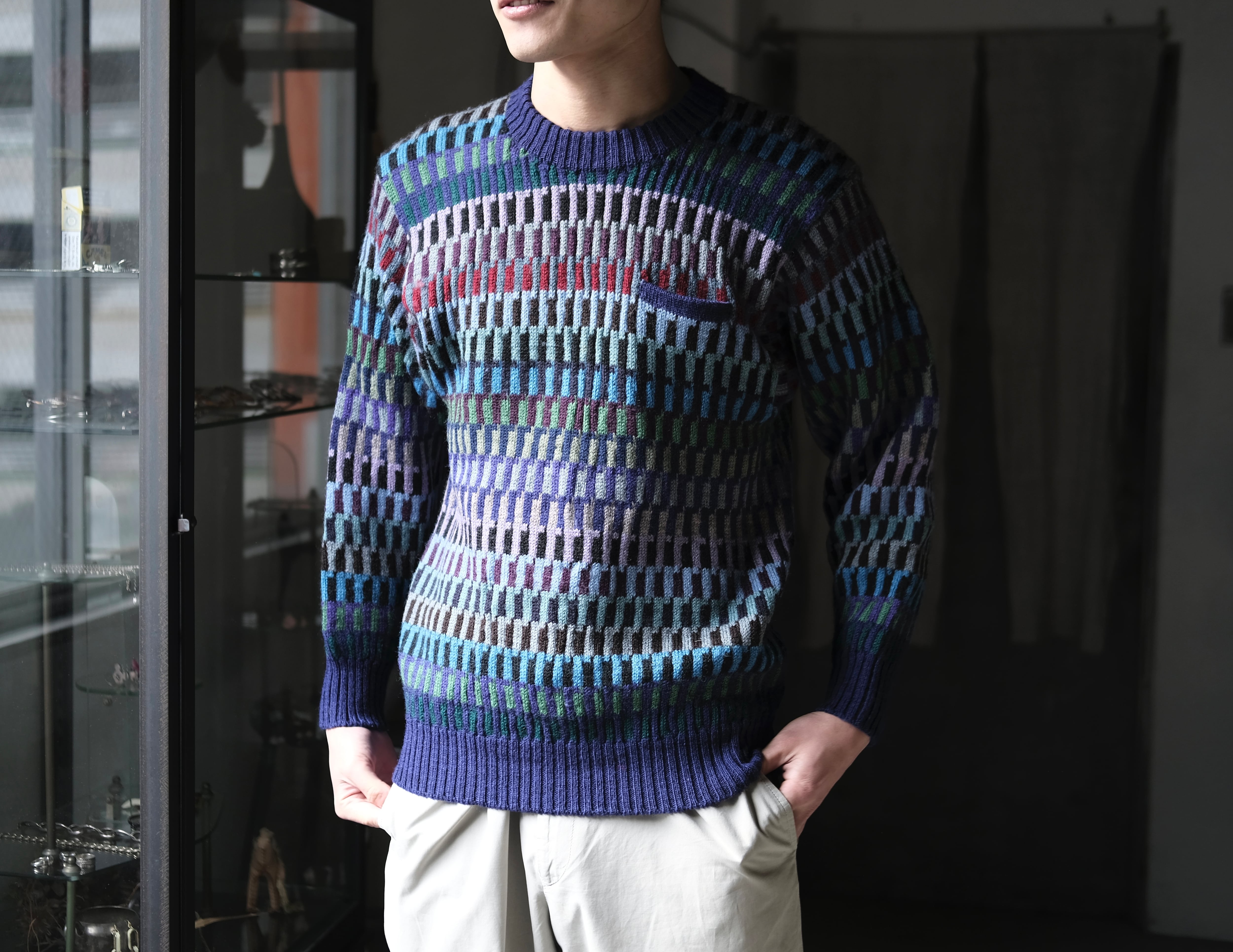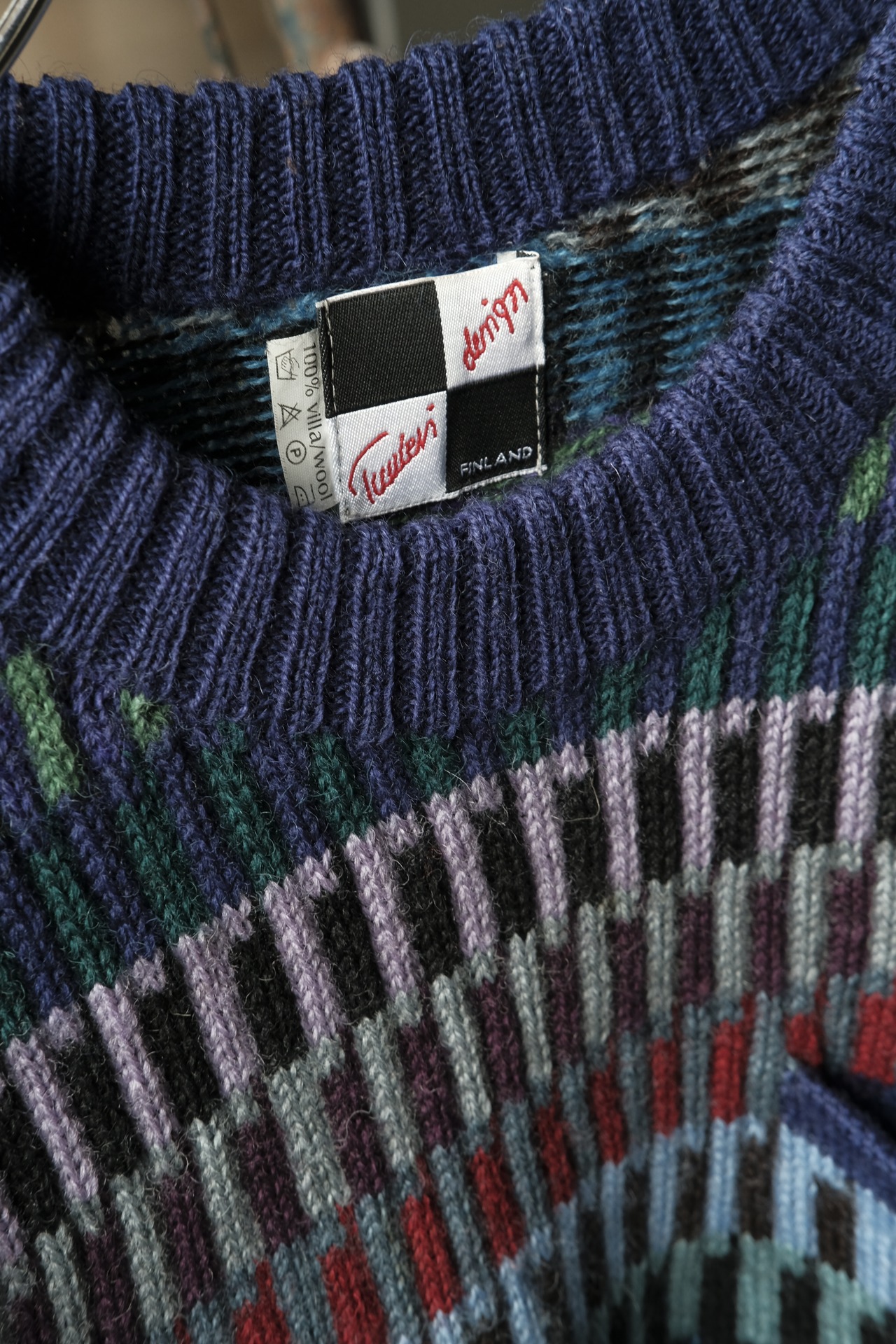 鮮やかなマルチカラーと繊細な幾何学模様が特徴的な一着。100%ウール素材を採用し、北欧の洗練されたデザインを反映したアイテムです。