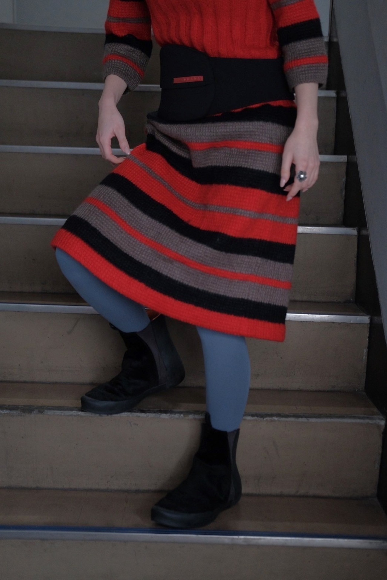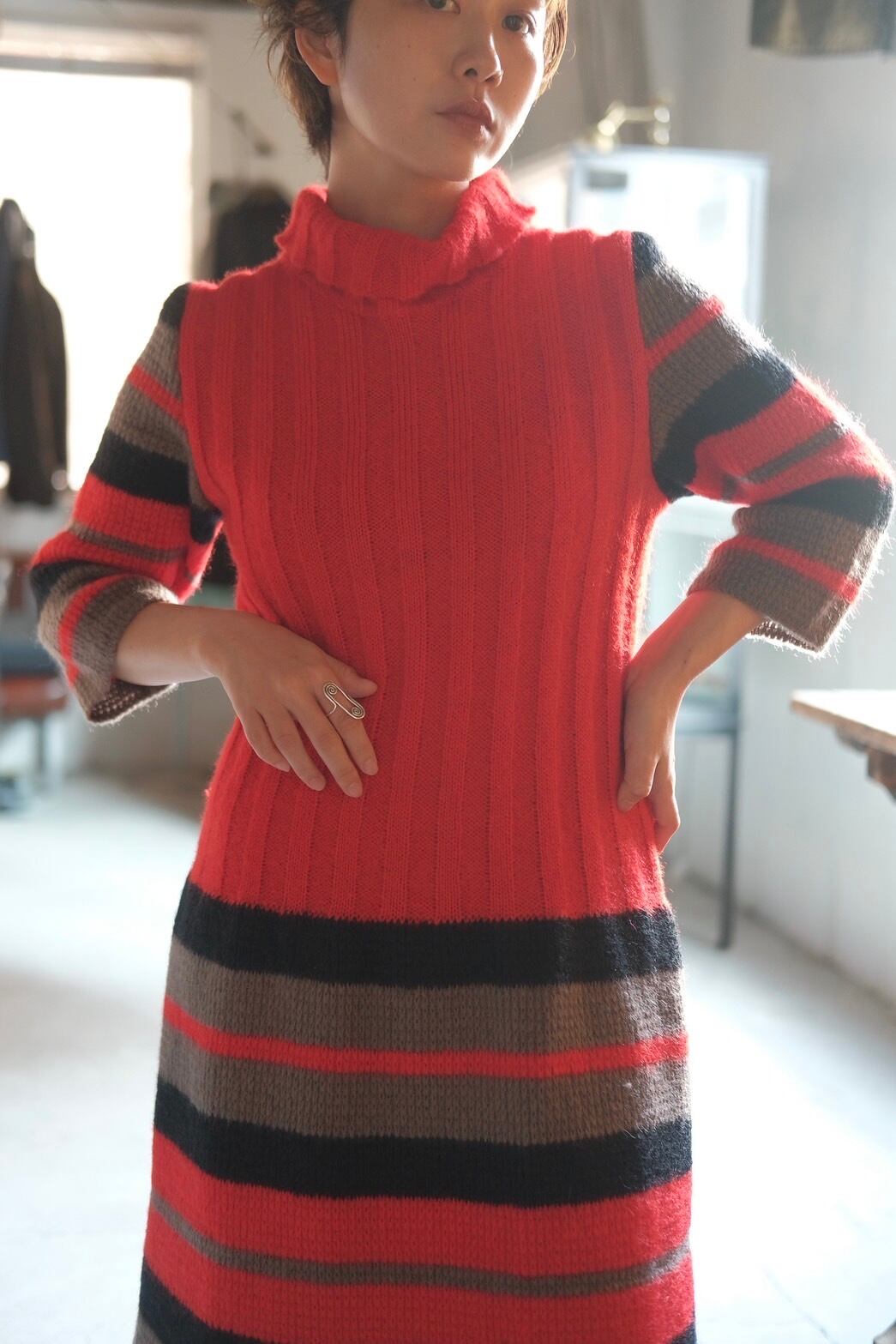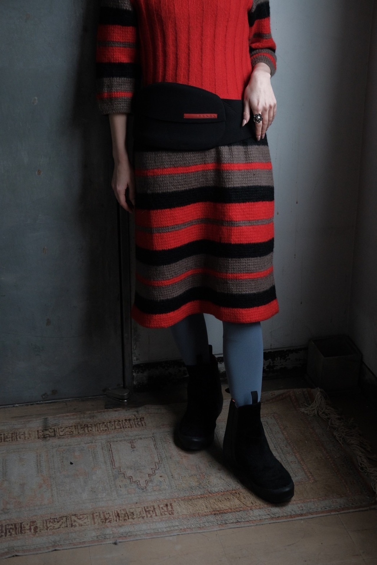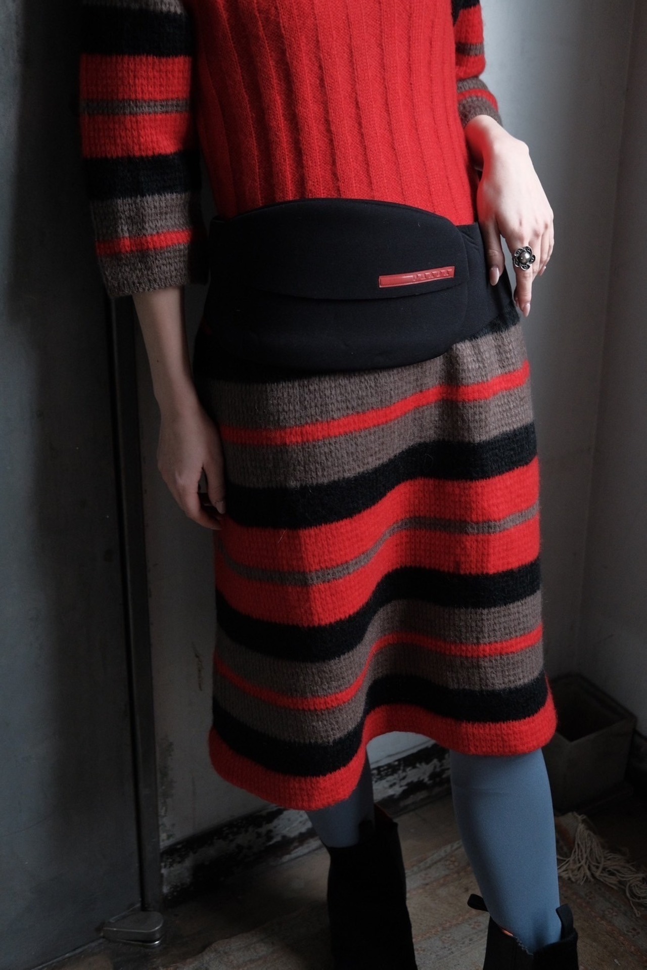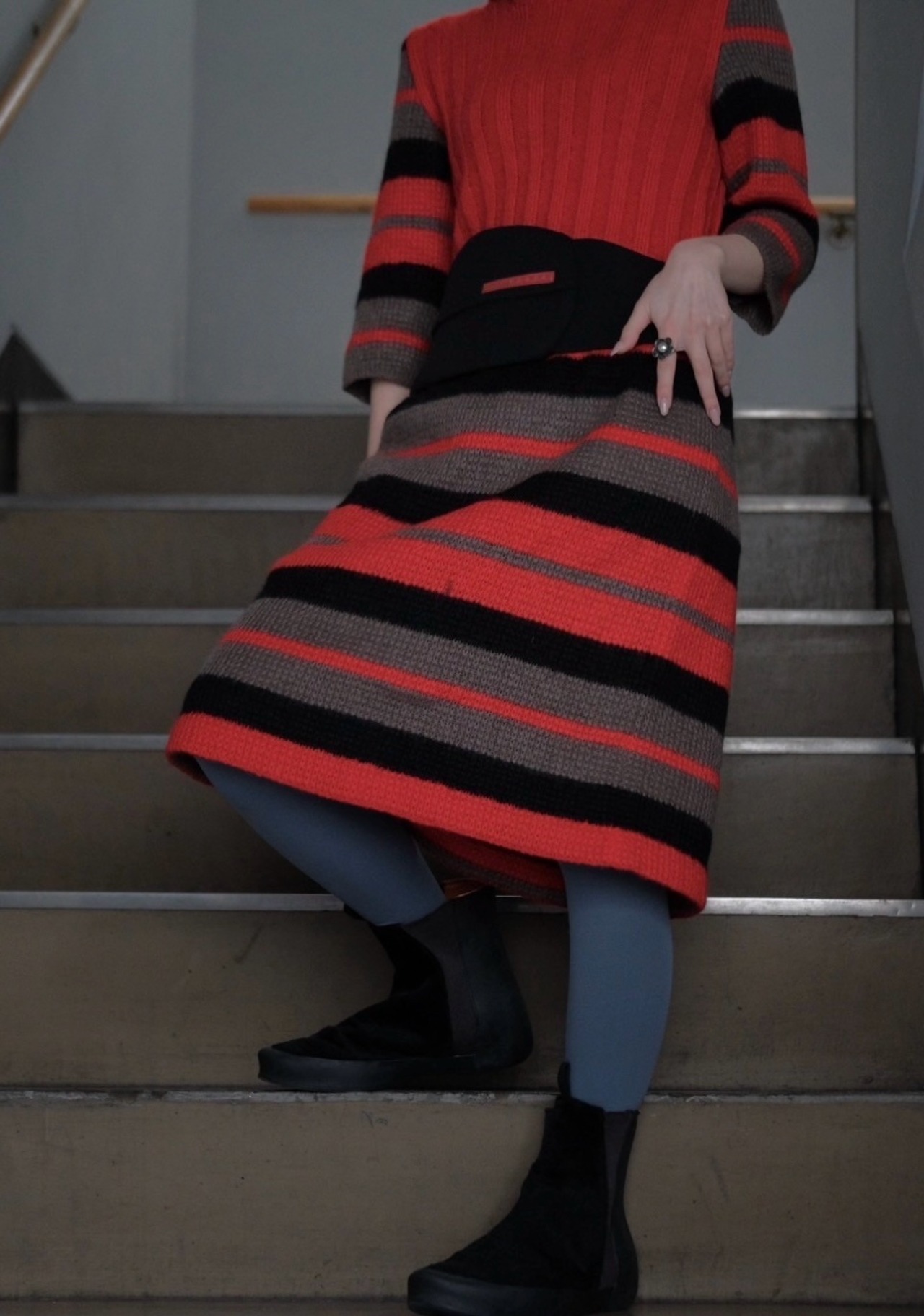 大胆な赤、チャコールグレー、ブラックのストライプ柄が視線を集めるイタリアンヴィンテージらしいデザイン。